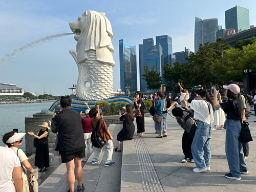 荷物も受け取り、換金も済ませ、いよいよバスに乗って市内に移動しました。ガイドの方のお話を聞きながら、マーライオン公園へ。空港から15分ほどで、シンガポールのランドマークの一つ、マリーナベイ・サンズが見えてきました。これまでテレビやネットで見てきた光景に、学生たちからは感嘆の声が漏れます。バスを降り、いよいよマーライオンとの対面です。多くの観光客に囲まれたマーライオンは、その後ろ姿だけでも圧倒的なオーラを感じます。学生たちは楽しそうに、お互いポーズの案を出し合いながら写真を撮っていました。束の間の自由時間となり、学生はそれぞれお土産を購入したり、ジューススタンドで珍しい果物の飲み物を注文したりしていました。英語での会話には少し苦戦したようですが、母国語以外の言葉でコミュニケーションを図る楽しさも同時に感じたようです。この経験を明日以降の研修に繋げてほしいと思います。
