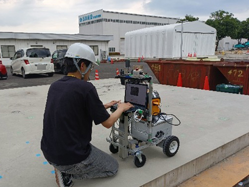 の賞は、大分高専、五洋建設株式会社、東北大学の3機関で共同開発している道路の劣化を自動検査するAI搭載ロボットの研究に対して送られたものです。日本版GPSである「みちびき」を使って高精度にロボットを位置制御して、AIで道路が劣化していないかも検査しながら、自動で道路の劣化地図を作っていきます。