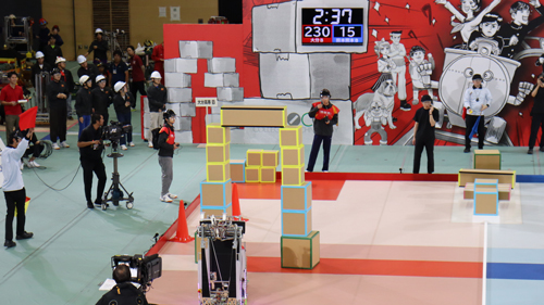 今年の競技名は「Great High Gate」で、ロボットがボックスを積み上げてゲートをつくり、そのゲートを人が乗った台車と一緒に通過し、積み上げたゲートの高さと通過した得点で競い合うルールでした。
