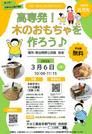 【参加者募集】第2回親子ものづくり講座「ベビー&キッズとものづくり!高専発!木のおもちゃを作ろう♪」