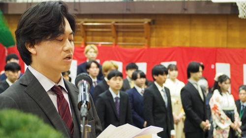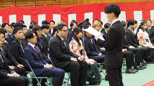 この日、卒業証書を手にしたのは機械工学科41名、電気電子工学科44名、情報工学科43名、都市・環境工学科40名の計168名、そして専攻科修了証書と学位記を手にしたのは機械・環境システム工学専攻21名、電気電子情報工学専攻13名の計34名、総勢202名です。