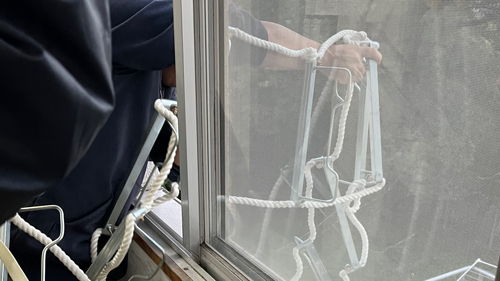 地震発生後の火災を想定した訓練という内容のもと、各寮で火災発生時の避難経路などの緊急時の行動を全員で確認しました。後期になって寮の移動もあったため、新しい寮での避難経路、避難時の役割や普段の生活の中で気を付ける点も確認できました。5寮では、ブロック長らが避難用はしごの点検も行いました。
